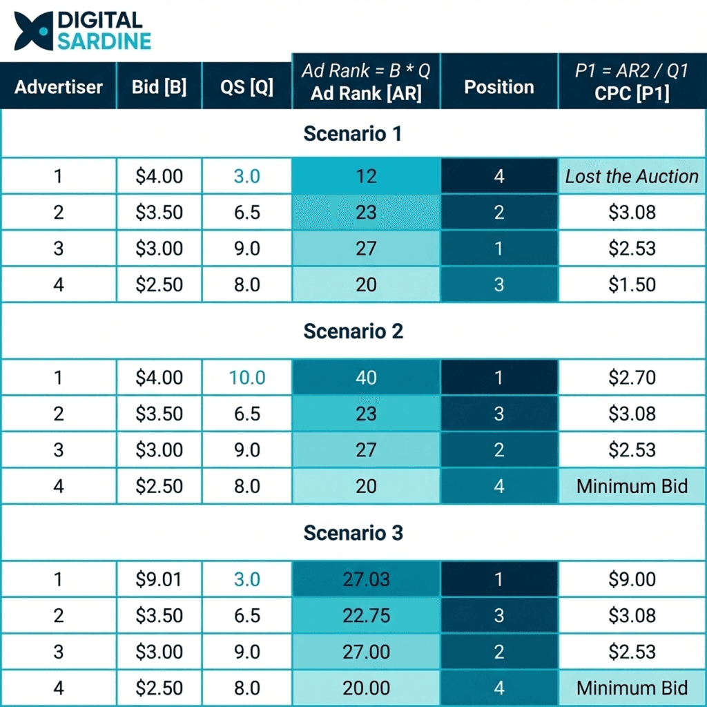 With a Quality Score of 3, Advertiser 1 would need to bid $9 to secure position one. That is an increase of $6.30 per click, or +233 percent, compared to having a Quality Score of 10.