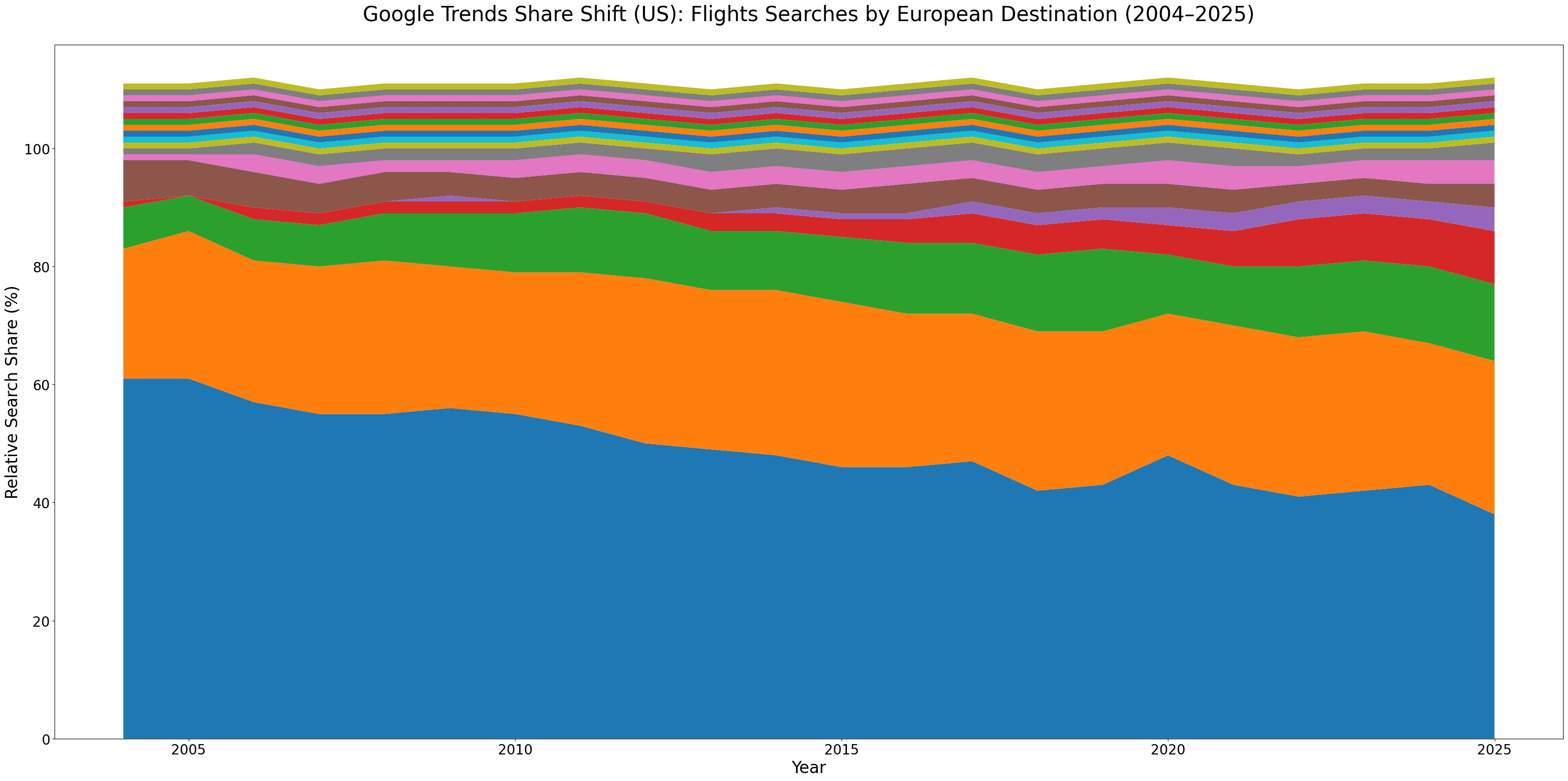To understand how demand distribution has evolved over time, I analyzed a directional sample of Google Trends data for U.S. users searching queries like “flights to [destination]” from 2004 through 2025.