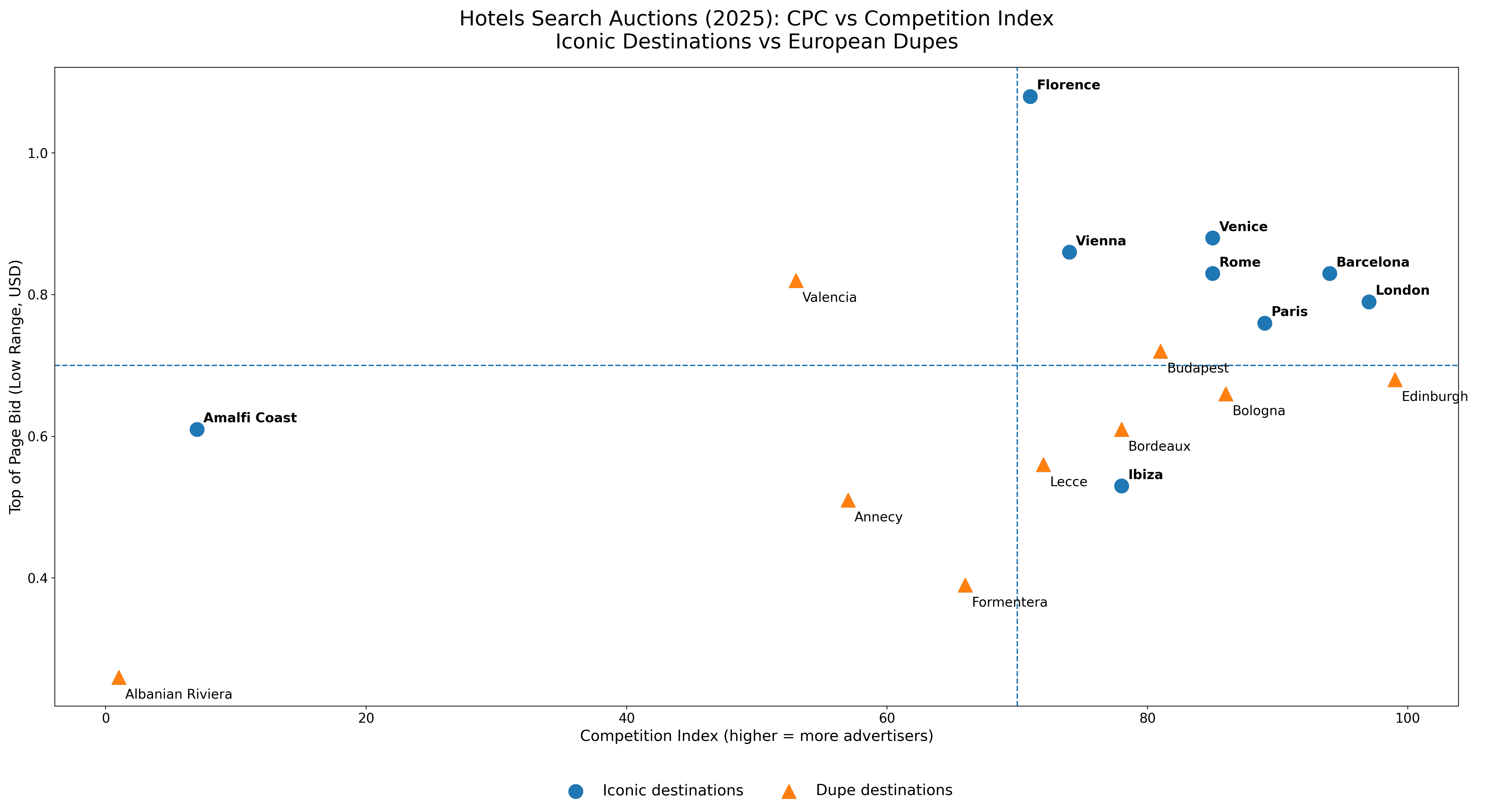 The CPC-versus-competition quadrant chart makes this dynamic explicit. Iconic destinations cluster in high-CPC, high-competition territory. Dupe destinations more frequently shift left and downward into more efficient zones. The opportunity is not universal, but where it exists, it is structural rather than tactical.
