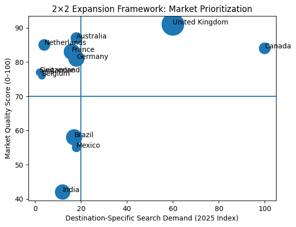 A disciplined expansion model evaluates markets across four dimensions simultaneously: overall search demand, Market Quality Score, destination-specific search demand, and operational complexity. When these factors are combined, expansion sequencing becomes strategic rather than reactive.