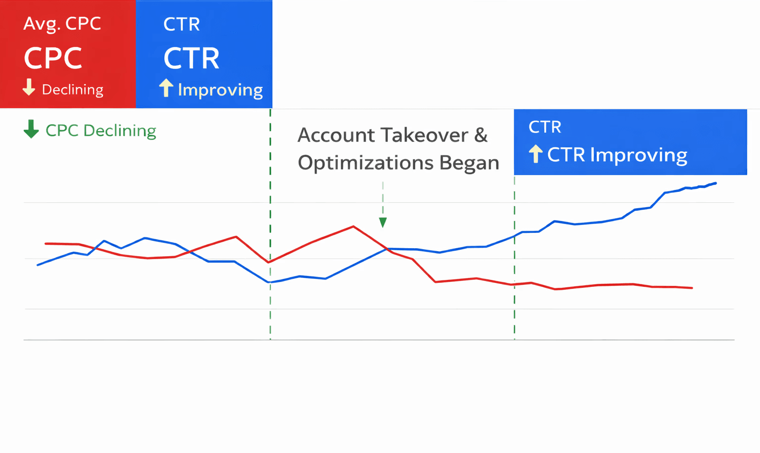 The chart below highlights this turning point, showing how performance and relevance improved dramatically after the account takeover and campaign optimization.